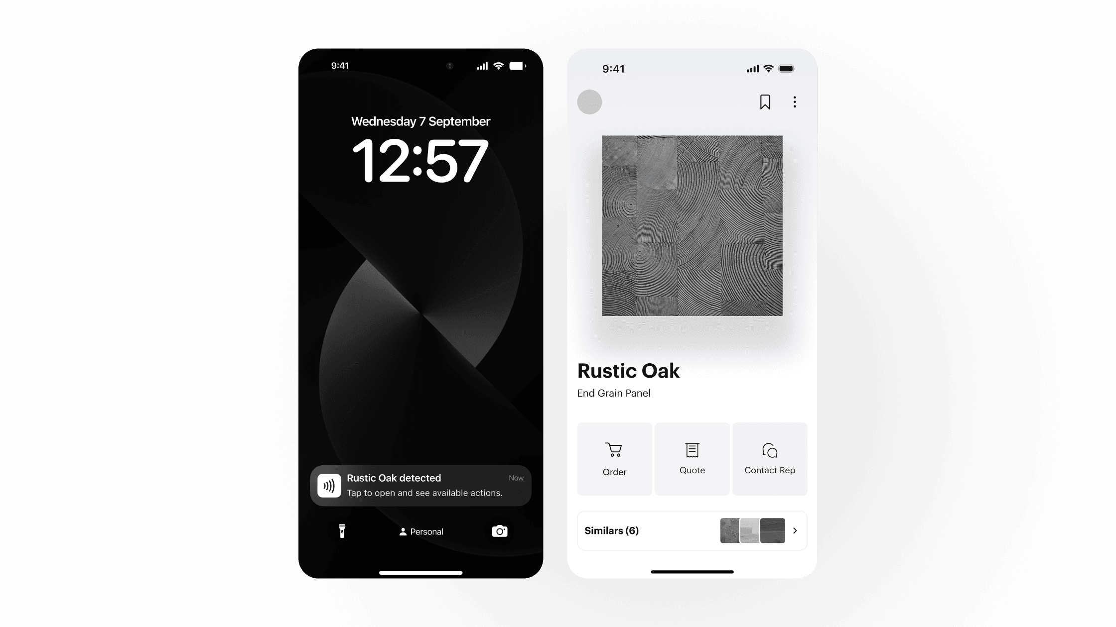An NFC-activated mobile experience that unlocks product details, actions, and tools the moment a user taps a material sample.